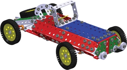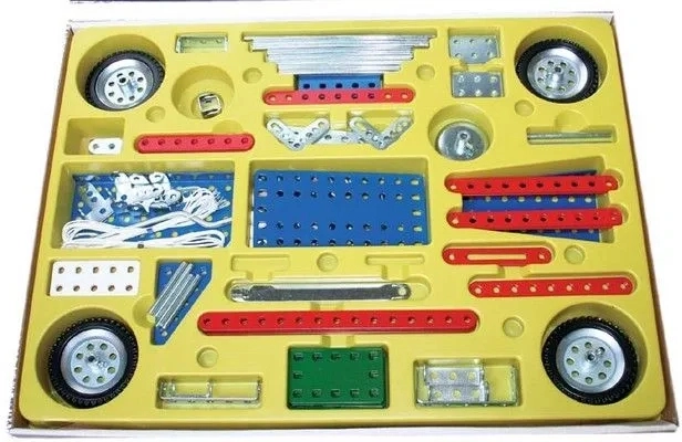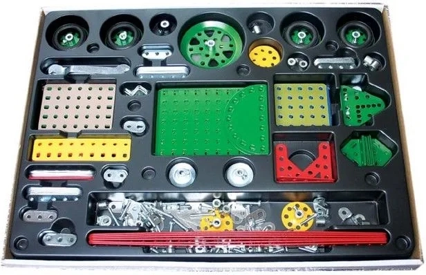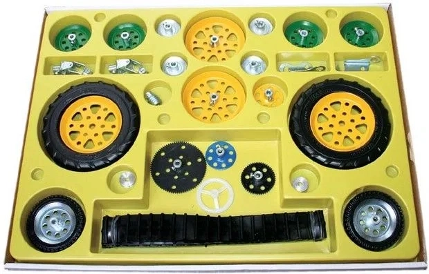 Ovaj građevni set sadrži sve što vam treba za izgradnju raznih modela, uključujući velika traktor kotača i zupčanike.