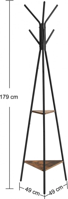 Stilska samostojeća vješalica u loft dizajnu s kombinacijom metala i drva prikladna je za predsoblje, garderobu, dnevni boravak i hodnik. Nudi 6 zaobljenih kukica za kapute i dodatke, 2 praktične police te stabilno trokrako postolje. Čvrsta željezna konstrukcija i izdržljivi MDF osiguravaju dug vijek trajanja, dok zaštitne nožice štite pod.