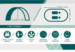Promišljena ventilacija s dvama bočnim prozorima i stražnjim mrežastim panelom održava ugodnu klimu u unutrašnjosti. 8 klinova i 4 džepa za pijesak povećavaju stabilnost i pri vjetru, dok je konstrukcija od stakloplastike lagana i elastična. Šator udobno prima 2 odrasle osobe, a nakon sklapanja zauzima minimalno mjesta u priloženoj torbi.