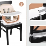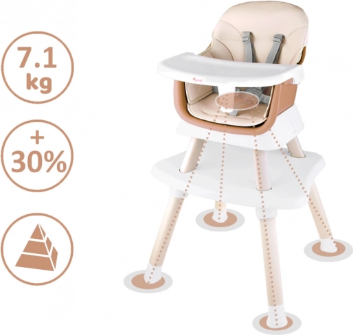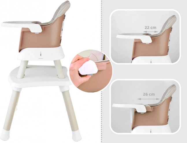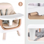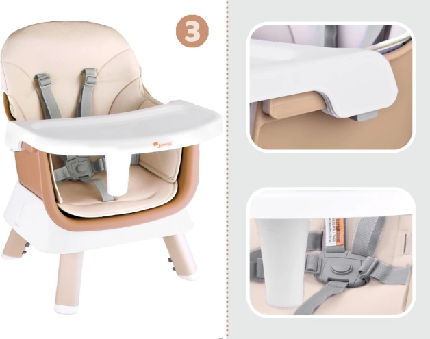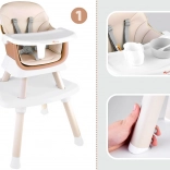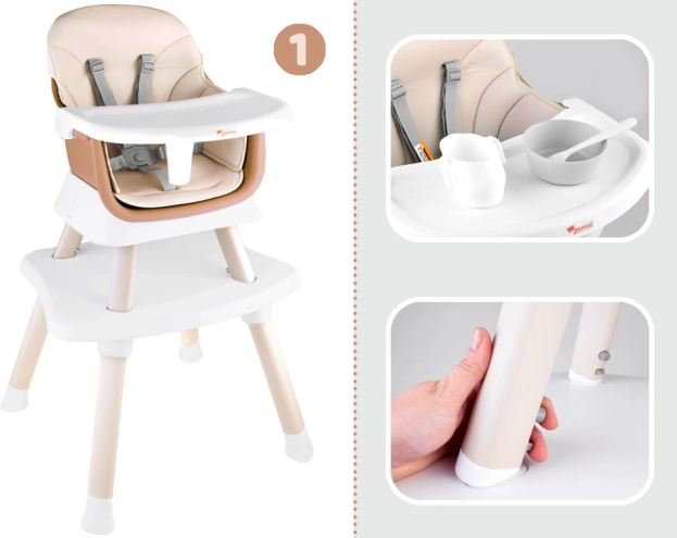 Ova višenamjenska hranilica 6u1 idealna je za prve kašice i samostalno jedenje. Nudi visoko i nisko sjedenje, mogućnost pričvršćivanja za stol, samostalan stolić za igru, pa čak i posebnu ploču za slaganje kocaka. Moderan dizajn uklapa se u svaki interijer, a jednostavno održavanje štedi vrijeme.
