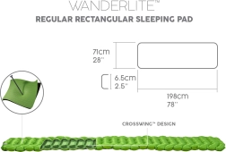 Napuhavajuća podloga BESTWAY WanderLite Large pouzdan je suputnik za kampiranje, planinarenje i festivale. Zahvaljujući velikodušnim dimenzijama 198 × 71 × 6,5 cm odlično pristaje i uz veće vreće za spavanje te pruža ugodnu izolaciju i potporu na neravnom podlošku. Kombinacija materijala ToughLite i ripstop najlona 70D donosi visoku otpornost na trošenje i trganje uz nisku težinu.