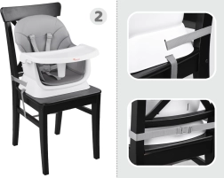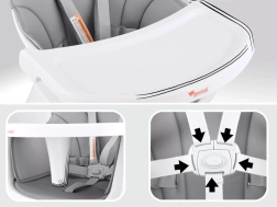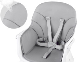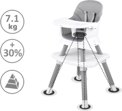 Sigurnost osiguravaju 5-točkasti pojasevi i zaštita protiv klizanja. Protuklizne kapice na nožicama drže hranilicu stabilno na mjestu. Sastavljanje i pretvaranje između načina rada je brzo i intuitivno, tako da se možete usredotočiti na ono bitno – udobnost i radost vašeg djeteta.