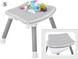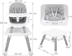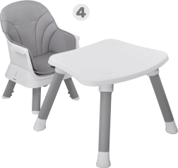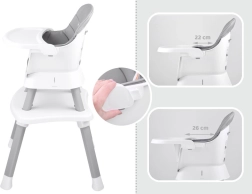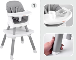Jedna hranilica pokriva hranjenje, blagovanje i igru: visoka i niska hranilica, nastavak za stolicu, stolica sa stolićem, ploča za igru s kockama i praktičan tabure.