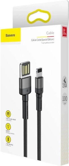 Izdržljiv kabel BASEUS Cafule za USB-A na Lightning nudi brzo punjenje 2,4 A i prijenos podataka 480 Mb/s. Zahvaljujući najlonskom pletivu, aluminijskim konektorima i obostrano izvedenom USB priključku podnosi svakodnevnu upotrebu bez petljanja. Duljina 1 m, boja sivo-crna.