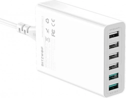 Punjač BlitzWolf sadrži šest portova, uključujući dva za brzo punjenje QC 3.0, što omogućuje istovremeno punjenje više uređaja s različitim zahtjevima za napajanje.