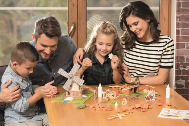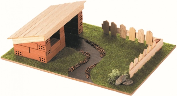 - više od 30 prirodnih glinenih opečica, više od 1,8 m drvenih letvica, osnovna podloga, slikovni priručnik, papirnate figurice, dekorativni dodaci, ljepilo