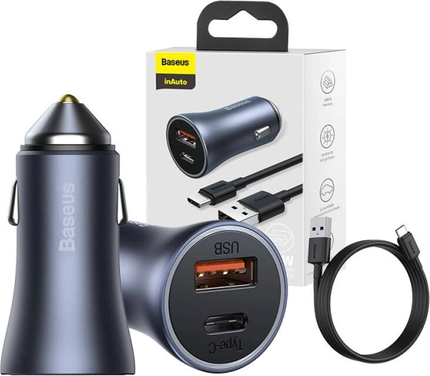 Brzi autopunjač BASEUS Golden Contactor Pro nudi snagu 40 W, dva priključka USB‑A i USB‑C te podršku za Power Delivery, Quick Charge 4.0+ i SCP. Zahvaljujući 7 razina zaštite, kompaktom metalnom kućištu i kabelu USB–USB‑C 1 m u pakiranju, sigurno ćete puniti telefon i tablet na svakom putovanju.