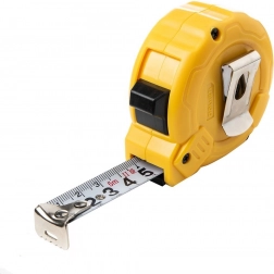 Ergonomsko kućište od izdržljive ABS plastike odlično leži u ruci i otporno je na udarce i svakodnevno trošenje. Praktična metalna kopča omogućuje pričvršćivanje na pojas, dok remenčić olakšava nošenje ili vješanje u radionici. Mjerna kuka na kraju trake podržava precizna unutarnja i vanjska mjerenja.