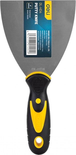 Univerzalna nerđajuća špahtla za kit širine 100 mm marke DELI za brze popravke, bojanje i građevinske radove. Oštrica od nehrđajućeg čelika je otporna na koroziju, elastična i precizna; udoban rad omogućuje ergonomska drška s otvorom za vješanje.