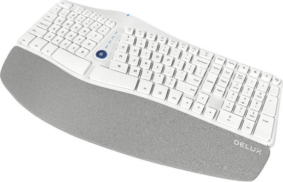 Uživajte u maksimalnoj udobnosti pri tipkanju s bežičnom ergonomičnom tipkovnicom DELUX GM901D. Nudi zakrivljen oblik za prirodan položaj ruku, integrirani oslonac za dlan od ugodnog materijala, povezivanje s do 3 uređaja putem Bluetootha 3.0/5.0 i 2,4 GHz, tihe i izdržljive tipke te praktične funkcijske prečace za medije i glasnoću.