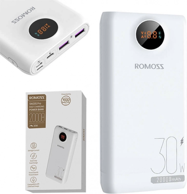 ROMOSS SW20S Pro je snažna powerbanka visoke kapacitete 20000 mAh koja će održati vaše uređaje u radu i tijekom zahtjevnih dana. Podržava brzo punjenje 30 W putem USB‑C i omogućuje punjenje do 3 uređaja odjednom (USB‑C + 2× USB). Integrirani LED zaslon jasno prikazuje postotak preostalog kapaciteta, trenutačni napon i struju te indicira način brzog punjenja.