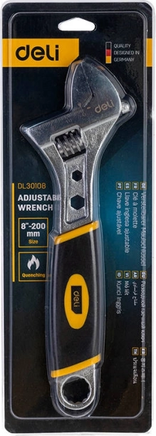Podesivi ključ Deli 200 mm s TPR drškom, laserskom skalom i kromiranjem. Izdržljiv, precizan i udoban alat s rasponom do 28 mm.