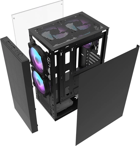 Bočna stranica od kaljenog stakla naglašava RGB osvjetljenje i daje sklopu premium izgled. Čist dizajn uklapa se i uz gaming i uz radne stolove.