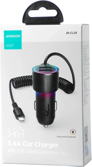 Punjač za auto Joyroom pruža brzo i učinkovito punjenje u pokretu s izlaznom snagom do 17 W. Dva USB porta zajedno s Lightning kabelom omogućuju punjenje do tri uređaja istovremeno. Uživajte u brzom punjenju zahvaljujući strujnom izlazu do 3 A.