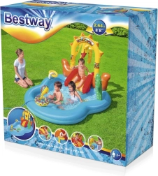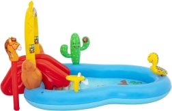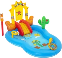 Uživajte u ljetu uz tematski vodeni centar Bestway Wild West. Šareni dizajn, sigurna konstrukcija i promišljeni dodaci jamče sate aktivne zabave na svježem zraku. Integrirani raspršivač spaja se izravno na vrtnu crijevo, a za udobno klizanje brine napuhani jastučić u podu.