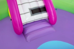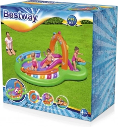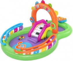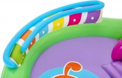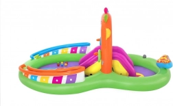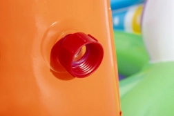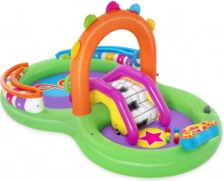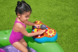 Istražite i uživajte u mnogim zabavnim značajkama s nafukavajućim vodenim igraćim centrom Sing and Splash. Igraće središte uključuje mikrofon i bubanj s kojima se djeca mogu igrati i tako potaknuti svoju maštu. Dvostruki bazeni povezani su uklonjivim toboganom pričvršćenim užadima i petljama. U pod je ugrađen nafukavajući jastuk za mekano doskakanje s tobogana. Luk s ugrađenim raspršivačem dovoljno je priključiti na vrtnu cijev. Na šiljke na luku mogu se bacati nafukavajući prstenovi. Dio seta je 6 šarenih loptica koje možete spuštati niz jednu ili drugu rampu. Ove igre nisu samo zabavne, već također razvijaju koordinaciju ruka-oko.