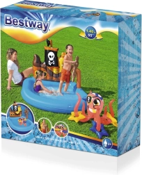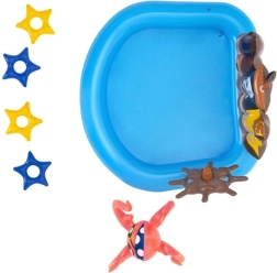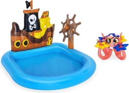 Pretvorite vrt u malo vodeno kraljevstvo. Ovo napuhujuće piratsko igralište BESTWAY nudi plavi bazen s dekorom broda, okretnim kormilom, bacajućim prstenovima/zvjezdicama i veselom hobotnicom. Izrađeno je od izdržljivog PVC-a, lako se postavlja i idealno je za sigurnu vodenu zabavu najmlađih.