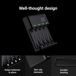 Pametna mehanika čvrsto drži baterije na mjestu i olakšava njihovo umetanje i vađenje. Izdržljivo ABS kućište s protukliznom završnom obradom i napredni sigurnosni sklopovi (toplinska zaštita, prenaponska zaštita i zaštita od kratkog spoja) štite vas i vaše akumulatore te osiguravaju dug vijek trajanja.