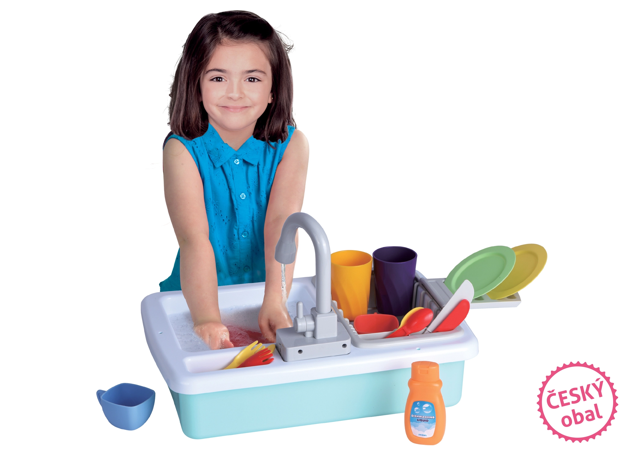 Dio pakiranja je praktična kuhinjska oprema s kojom djeca mogu odmah započeti: šalice, tanjurići, šalice za čaj, pribor za jelo te i detergent za posuđe za još realističniju igru. Sudoper je izvrstan dodatak svakoj dječjoj kuhinjici i zabavit će na duge sate.