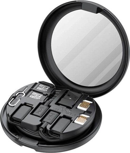 Integrirani utori za SIM i microSD (TF), ugrađeni USB‑C kabel i adapteri proširuju kompatibilnost s većinom telefona i gadgeta. Kućište se dodatno može pretvoriti u praktičan držač telefona za gledanje videa ili video pozive, dok će diskretno zrcalce poslužiti za brze preinake izgleda.