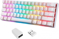 Kompaktna 60% bežična mehanička tipkovnica Motospeed SK62 White s plavim OUTEMU prekidačima nudi 3 načina povezivanja (Bluetooth 5.0 / 2,4 GHz / USB‑C), RGB pozadinsko osvjetljenje s 16,8 mil. boja i autonomiju do 260 h bez pozadinskog osvjetljenja. Idealna za posao i igranje zahvaljujući ergonomiji, multimedijskim tipkama i kompaktnoj izvedbi bez numeričkog bloka.