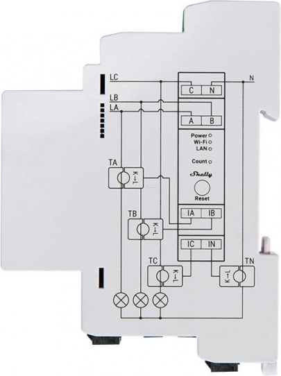 Shelly Pro 3EM 120 A je pouzdano trofazno brojilo za detaljan nadzor potrošnje. Mjeri napon, struju te aktivnu/prividnu snagu u stvarnom vremenu na svakoj fazi, izračunava faktor snage i pohranjuje minutne podatke do 60 dana za preciznu analizu. Zahvaljujući podršci za LAN, Wi‑Fi i Bluetooth lako ga povezujete u mrežu i bez potrebe za cloudom.