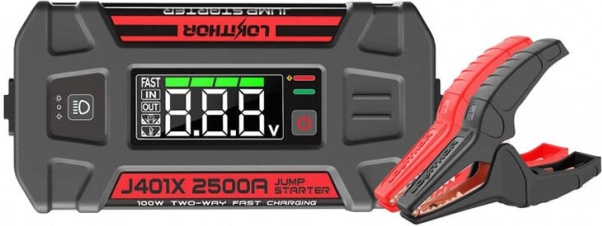 Multifunkcionalni startni izvor i power banka LOKITHOR J401X s snagom 2500 A pouzdano pokreće benzinske motore do 8,5 l i dizelske do 6,5 l. Kompatibilna je s 12 V vozilima, nudi brzo punjenje do 100 W i integriranu LED svjetiljku s tri načina rada (SOS, stroboskop, stalno svjetlo). Kompaktno rješenje za putovanja za sigurno pokretanje i napajanje vaših uređaja.