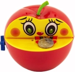Ova plastična kasica imitira popularnu jabuku i idealna je za djecu od tri godine. Zahvaljujući mehaničkom navijanju na ključ, korištenje je zabavno i jednostavno. Nakon umetanja novčića, crvić ga uhvati i odnese unutar jabuke, motivirajući djecu na štednju.