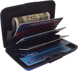 Vanjski sloj izrađen je od aluminija, koji sprječava neželjeno skeniranje čipova. Unutarnji, lepezasti prostor s 6 pretinaca pruža savršen red za kartice i posjetnice. Jednostavno otvaranje i zatvaranje osigurava praktični gumb.