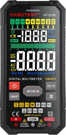 HABOTEST HT127B spaja široke mogućnosti mjerenja s jednostavnim upravljanjem i izdržljivom konstrukcijom. Zahvaljujući kompaktnim dimenzijama dobro leži u ruci, mekana maska ublažava udarce, a pozadinski osvijetljen VA zaslon jamči dobru čitljivost i u lošijim uvjetima. Funkcija TRUE RMS pruža točne rezultate i kod nelinearnih signala.