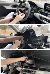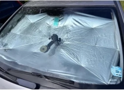 Sjena se rasklapa poput kišobrana i lako se pričvršćuje na unutarnju stranu vjetrobranskog stakla. Specijalni srebrni premaz reflektira sunčeve zrake, održavajući unutrašnjost automobila hladnom.