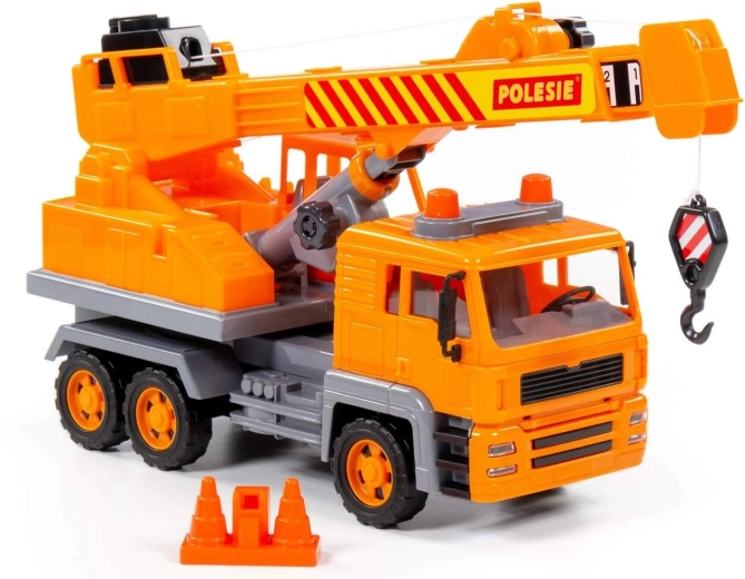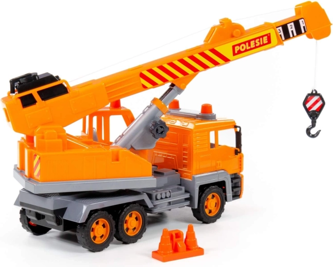 Serija specijalnih strojeva "Dijamant" na zamašnjak proizvođača Polesie uključuje glavne tipove vozila koja se u stvarnom životu koriste pri različitim radnim zadacima. Vozila imaju realističan izgled s naglaskom na detalje: tu su imitacije svjetala, svjetlosnih signala i tri para kotača na metalnim osovinama. Dizalica na kamionu opremljena je rotirajućom platformom i izvlačivom grabilicom s obješenu kukom. Kuku je moguće podizati i spuštati pomoću ručnog mehanizma. Igračka dodatno sadrži građevinske čunjeve koji igru čine zanimljivijom i potpunijom.