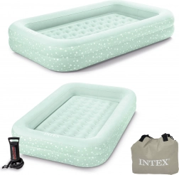 Madrac na napuhavanje Intex dimenzija 168x107x25 cm savršen je za djecu tijekom putovanja - u hotelima, kampiranju i slično. Izrađen je od izdržljivog PVC-a i prekriven mekanim, vodootpornim velurom u ugodnoj zelenoj boji, koja se savršeno uklapa u svaku sobu. Boston ventil omogućuje lako ispuhivanje unutar samo jedne minute, nakon čega se madrac može sklopiti i pohraniti.