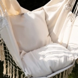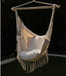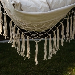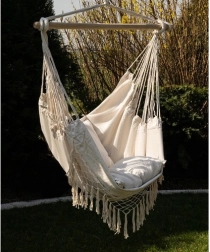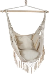 Ova udobna viseća fotelja tipa hamaka podiže opuštanje na višu razinu. Zahvaljujući kombinaciji pamuka i poliestra, tkanina je ugodna na dodir, a istovremeno čvrsta i postojana. Drvena razuporna letva i ravnomjerno provedena užad osiguravaju stabilan položaj i jednostavno vješanje.
