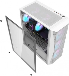 Ovo kućište se ističe svojim prozirnim bočnim panelom i prednjim panelom sa mrežastom strukturom, dajući moderan industrijski izgled.