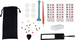 Uključuje grebalicu, kist za čišćenje, jedinstvene naljepnice, ravnalo s povećalom i pribadače, sve u praktičnoj vrećici.