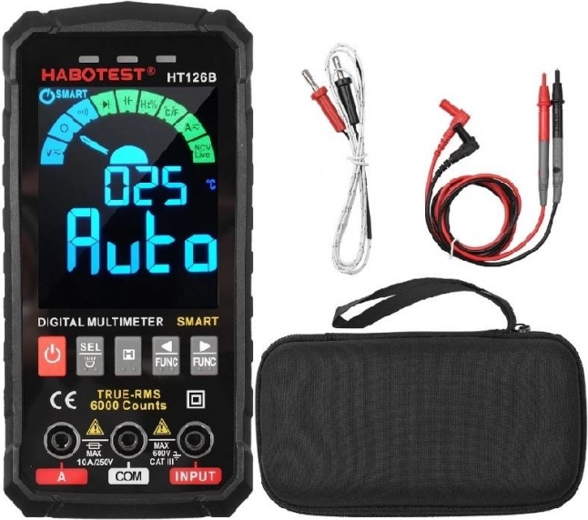 Multimetar HABOTEST dizajniran je za precizno i udobno mjerenje na terenu i u radionici. Zahvaljujući true‑RMS pruža pouzdane rezultate i kod nelinearnih signala, 6000 counts osigurava fino razlučivanje, a velik VA zaslon s pozadinskim osvjetljenjem nudi izvrsnu čitljivost. Silikonske tipke, LED svjetiljka i kompaktno kućište (pribl. 146 × 72 × 26 mm, 182 g) povećavaju udobnost i u težim uvjetima.