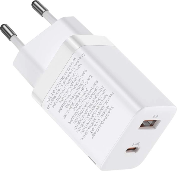 Kompaktni mrežni punjač BASEUS Super Si Pro s snagom 30 W nudi dva porta – USB-C i USB-A – za istovremeno punjenje dvaju uređaja. Podržava brzo punjenje PD 3.0 i QC 3.0, ima široku kompatibilnost sa pametnim telefonima, tabletima i sitnom elektronikom te zahvaljujući inteligentnoj zaštiti osigurava siguran rad kod kuće i na putu (AC 100–240 V).