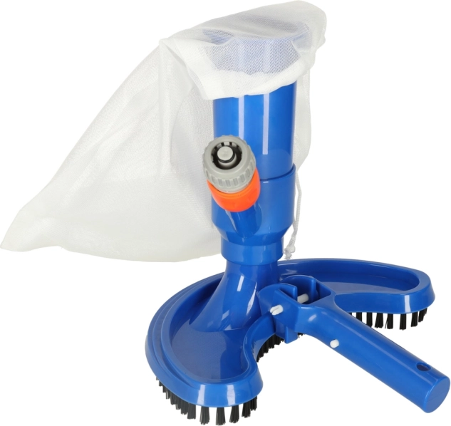 Ručni usisavač za bazen za lako čišćenje dna, stijenki i stepenica bazena te vrtnih ribnjaka. Koristi tlak vode iz vrtnog crijeva i prljavštinu zadržava u višekratnoj mrežastoj vrećici. Polukružna glava s četkama doseže i u kutove, brza spojka osigurava brzo priključenje, a jednostavno rukovanje ne zahtijeva nikakav alat.