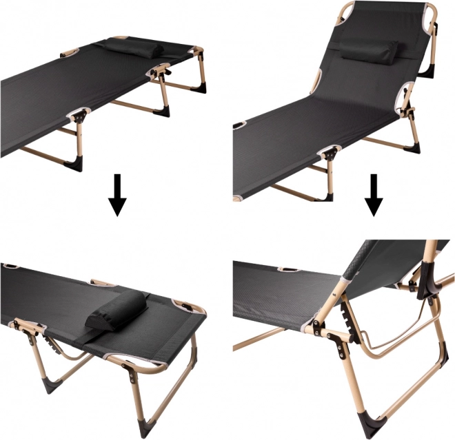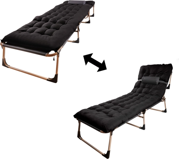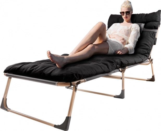 Udoban i izdržljiv sklopivi ležaj za kampiranje, terasu i vrt. Ima čelični okvir s praškastim premazom, naslon podesiv u 4 razine i čvrstu Oxford 1200D tkaninu. U paketu je mekani madrac i mali jastučić za maksimalnu udobnost. Jednostavno se sklapa i prenosi – idealno za auto ili karavan.