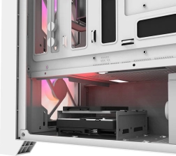 Unutarnji prostor prima grafičke kartice do 350 mm, hladnjake CPU-a do 180 mm i nudi 7 proširivih utora. Pohranu rješavate kombinacijom pozicija za 2× HDD i 1× SSD, ne nedostaju provrti za uredan cable management te stabilne nožice s prigušnim podloškama. Za vodeno hlađenje predviđena je podrška za radijatore do 280 mm na vrhu.