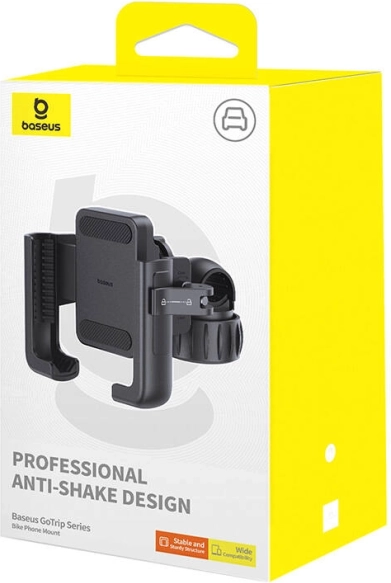 Držač BASEUS GoTrip dizajniran je za sigurno pričvršćivanje telefona pri vožnji bicikla, romobila ili skutera. Poboljšani amortizacijski sustav učinkovito upija vibracije i zajedno s masivnom blokadom na volanu osigurava maksimalnu stabilnost i pri naglom kočenju ili vožnji po kaldrmi.