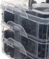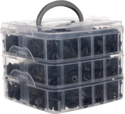 Praktična kutija s prozirnim katovima i sigurnosnim kopčama drži kopče pregledno i sigurno. Jednostavno prenošenje zahvaljujući čvrstoj ručki.
