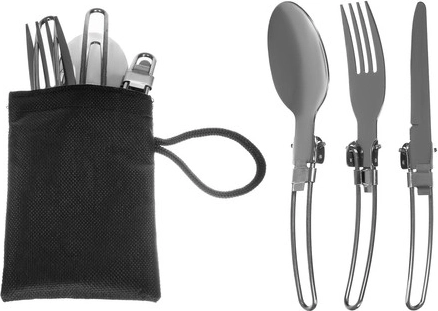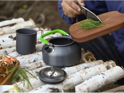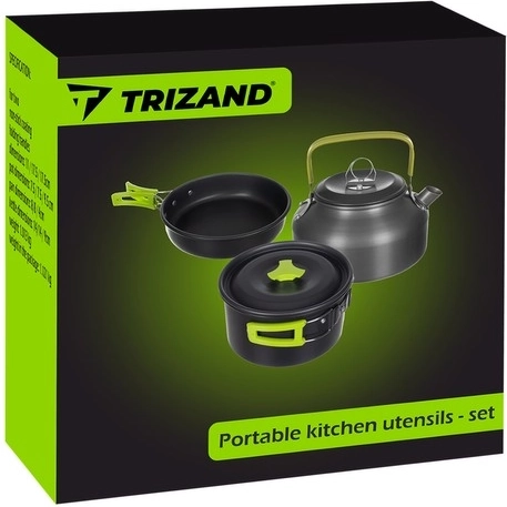 - Kompletna oprema – lonac, tava, čajnik s poklopcem, univerzalni poklopac, 2x nož, 2x vilica, 2x žlica, 2x karabiner, 2x sklopiva čašica, 2x futrola za pribor, transportna vrećica.