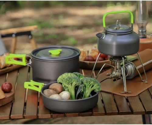 Kompaktan kamperski set posuđa za 2 osobe s neljepljivom površinom i sklopivim ručkama. Sadrži lonac, tavu, čajnik, sklopivi pribor, sklopive čašice i praktičnu transportnu vrećicu. Idealan za kampiranje, planinarenje i kuhanje na otvorenom.