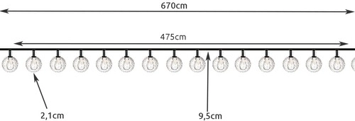 Girlanda zrači toplo žuto svjetlo, što je idealno za ambijentalnu rasvjetu. Kuglice su postavljene na razmaku od 9,5 cm na dugom zelenom kablu, koji gotovo nevidljivo blijedi s okolnom zelenilom.