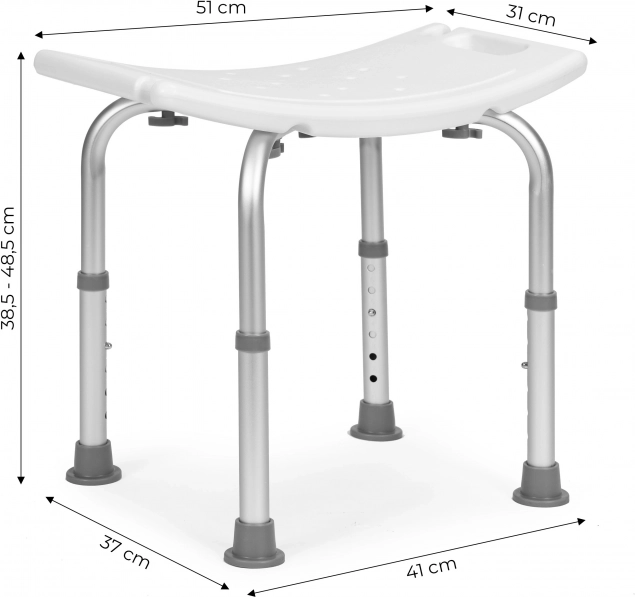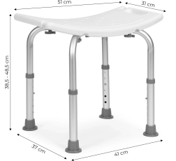 Teleskopske noge omogućuju precizno podešavanje visine u 6 razina (36–48,5 cm), pa lako prilagodite položaj svojoj visini i vrsti tuš kabine. Praktične bočne ručke i držač tuš ručice povećavaju udobnost i sigurnost pri uporabi.