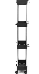 Kotačići s kočnicom omogućuju glatko premještanje, a dva se mogu blokirati za sigurno i stabilno stajanje. Aluminijske cijevi učvršćuju cijelu konstrukciju i daju joj moderan izgled. 8 dodatnih kukica pruža mjesto za ručnike, spužvice ili kuhinjski pribor.