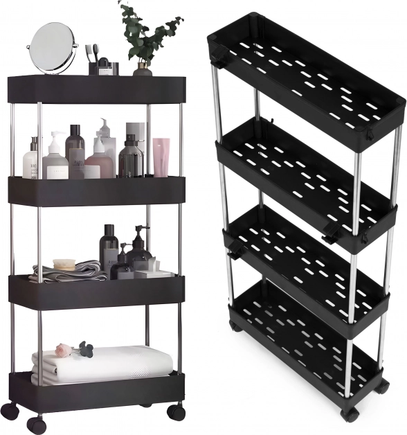 Održavajte red i u uskim prostorima. Ovaj uski plastični regal ModernHome nudi izdašan prostor za pohranu na 4 police za kozmetiku, ručnike, sredstva za čišćenje ili namirnice. Zahvaljujući tanko profiliranom dizajnu savršeno stane između ormarića, perilice ili uz tuš kabinu.