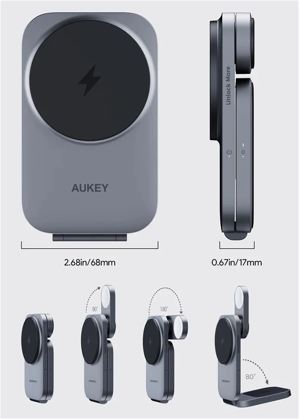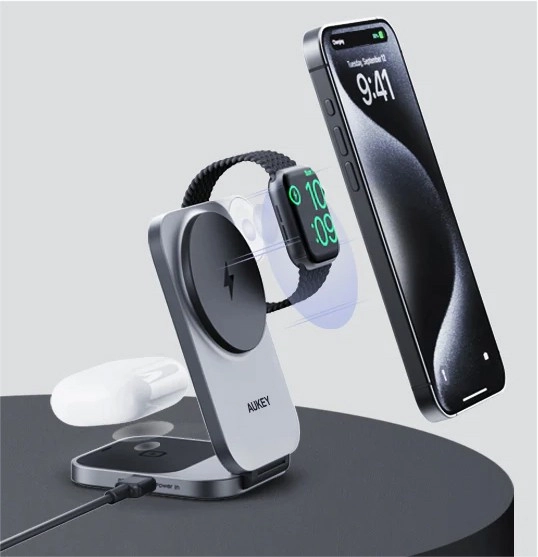 Iskusite brzo i sigurno bežično punjenje cijele vaše Apple opreme u jednoj kompaktnoj stanici. AUKEY MagFusion koristi Qi2 s izlazom do 15 W za iPhone te istodobno puni Apple Watch i kućište slušalica AirPods. Stabilno magnetsko pričvršćivanje i podesiv kut čine ga idealnim stalkom za videopozive i gledanje sadržaja.